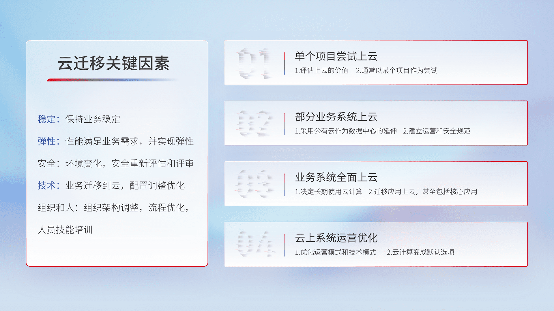 结合实际业务,,,从规划设计、、云平台选型、、云原生改造、、数据迁移、、、集成交付,,,,迁移全过程为客户识别最佳上云路径,,做好风险识别管理,,,,设计网络架构、、身份权限、、、安全审计合规、、操作审计、、、、日志审计、、、监控告警策略、、、多站点容灾设计等,,,对云上基础设施进行整体规划,,提升IT治理水平,,,,以满足弹性、、、高可用、、高性能的需求。。