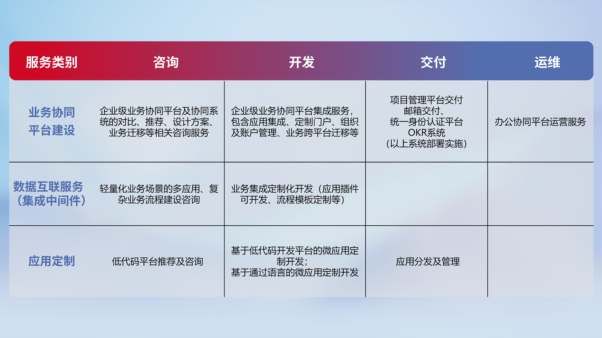 针对钉钉、、、、企微、、IDaas等平台级产品提供产品的规划、、、方案、、交付、、、、定制化开发等服务,,,实现如统一协同办公、、智能客户服务、、、混合会议管理、、、、智能数据查询、、、、等业务场景,,,,实现数字化转型。。